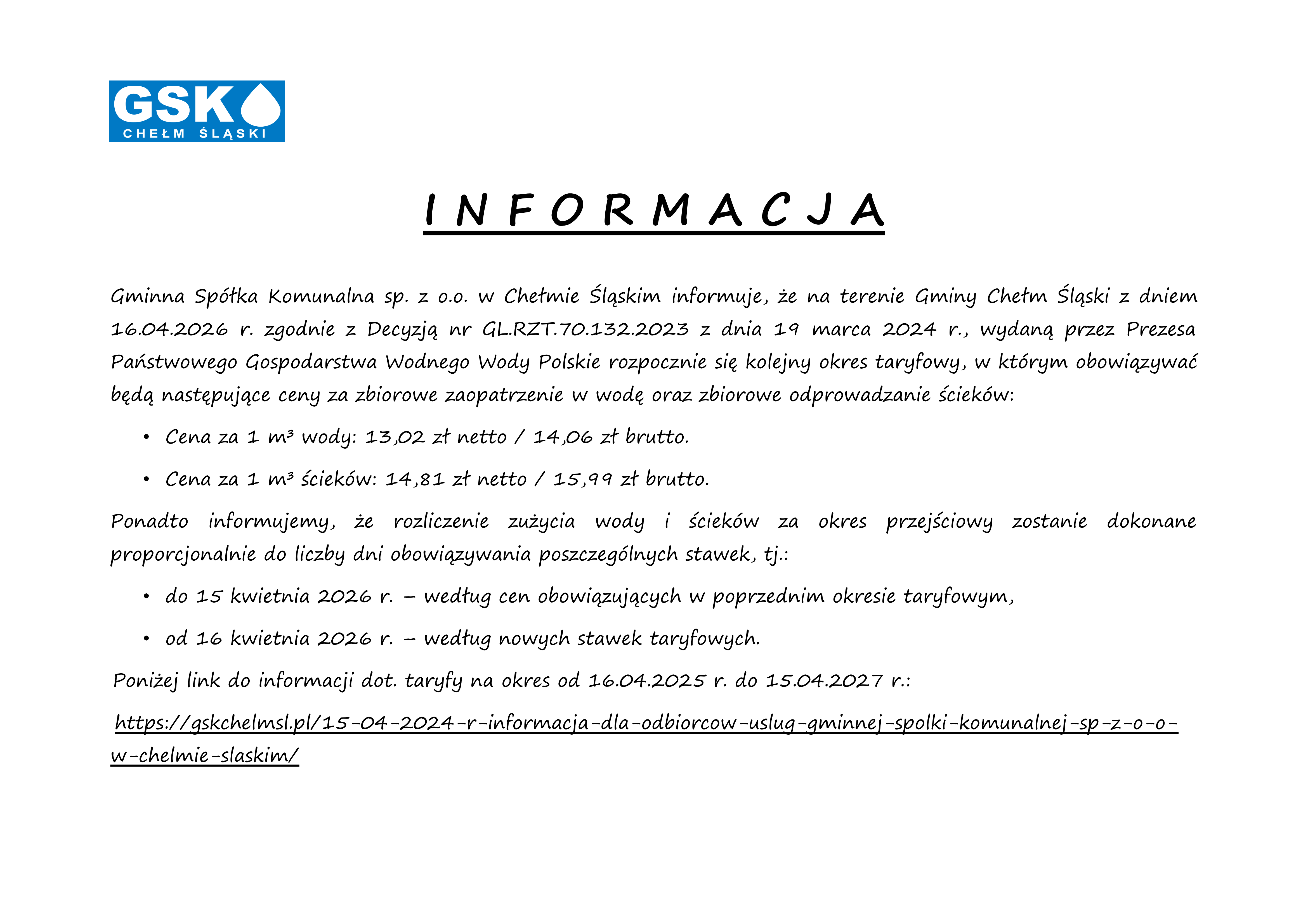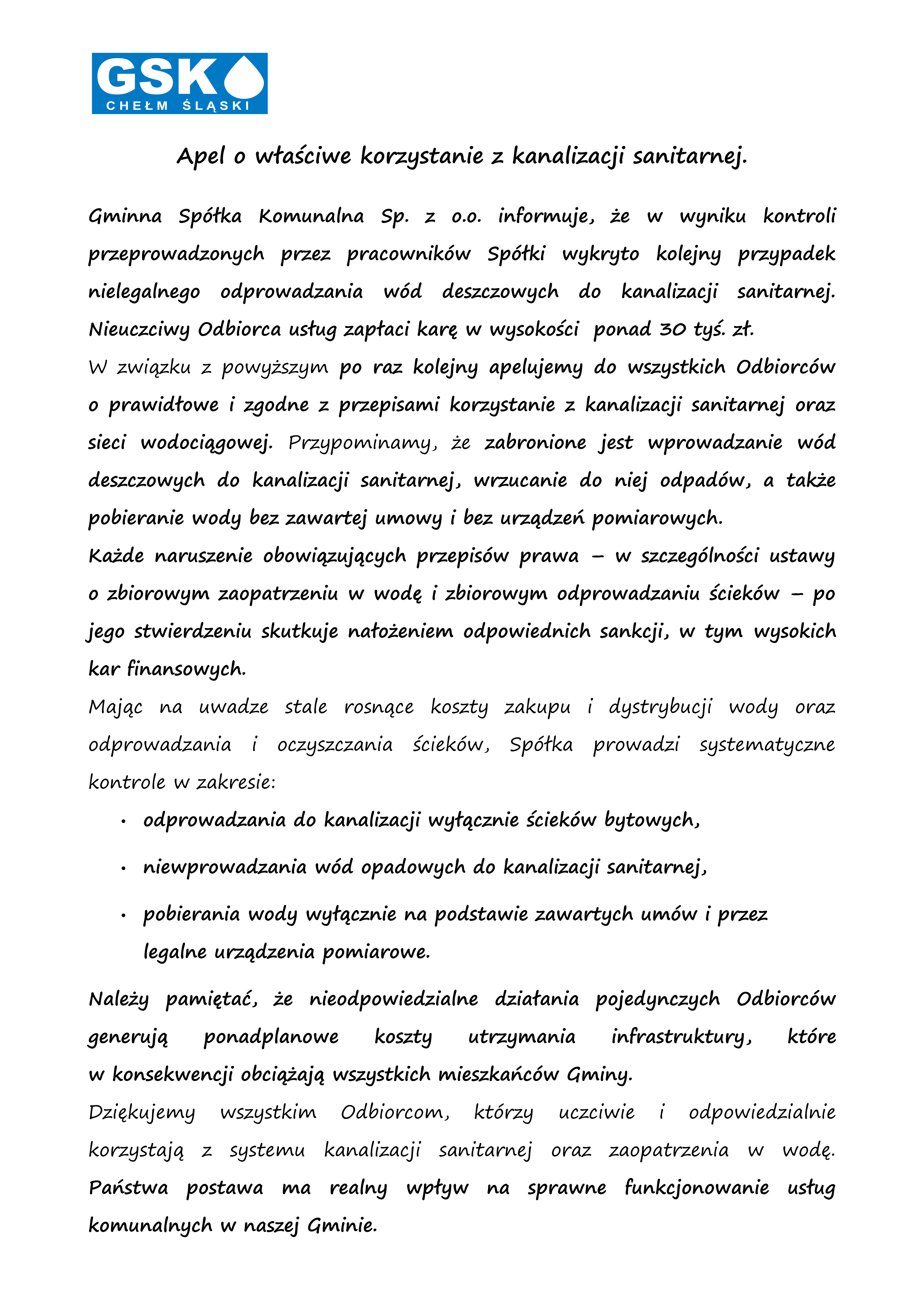 Gminna Spółka Komunalna Sp. z o.o. w Chełmie Śląskim prowadzi działalność od początku 2006 roku. Głównym przedmiotem działalności Spółki są usługi w zakresie poboru, uzdatniania i dostarczania wody oraz zbiorowego odprowadzania i oczyszczania ścieków z terenu Gminy Chełm Śląski. Działalność w zakresie zbiorowego odprowadzania i oczyszczania ścieków Spółka rozpoczęła 01.01.2006 roku, natomiast w zakresie poboru, uzdatniania i dostarczania wody 01.01.2010 roku w związku z przejęciem od RPWiK w Katowicach Zakładu nr 4.